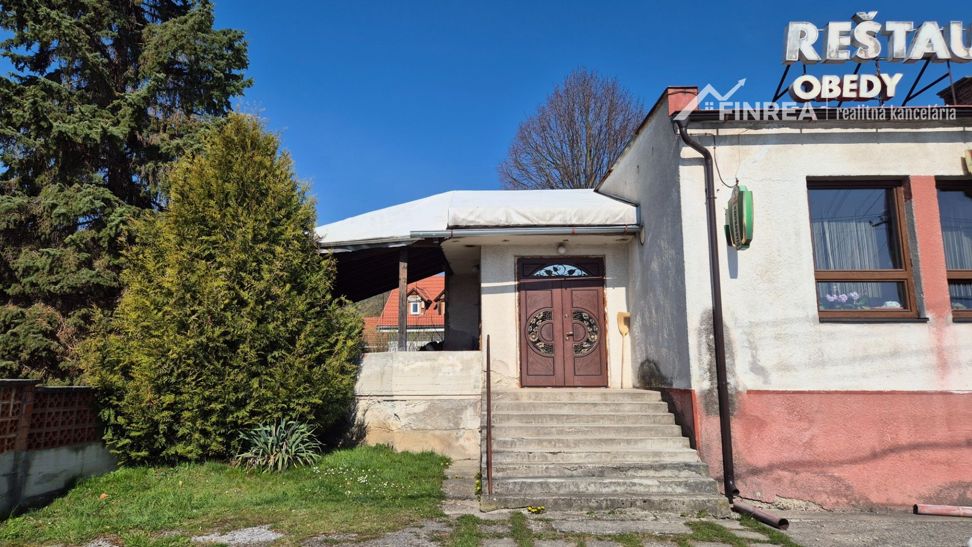 Rovinatý pozemok so záhradou a parkovaním pred reštauráciou