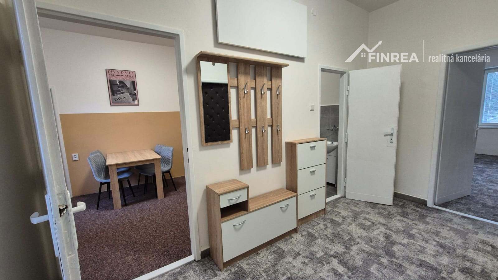 The apartment is entered through a spacious hallway connecting all rooms. From the hallway there is access to the living room, kitchen, WC, bathroom, and balcony.